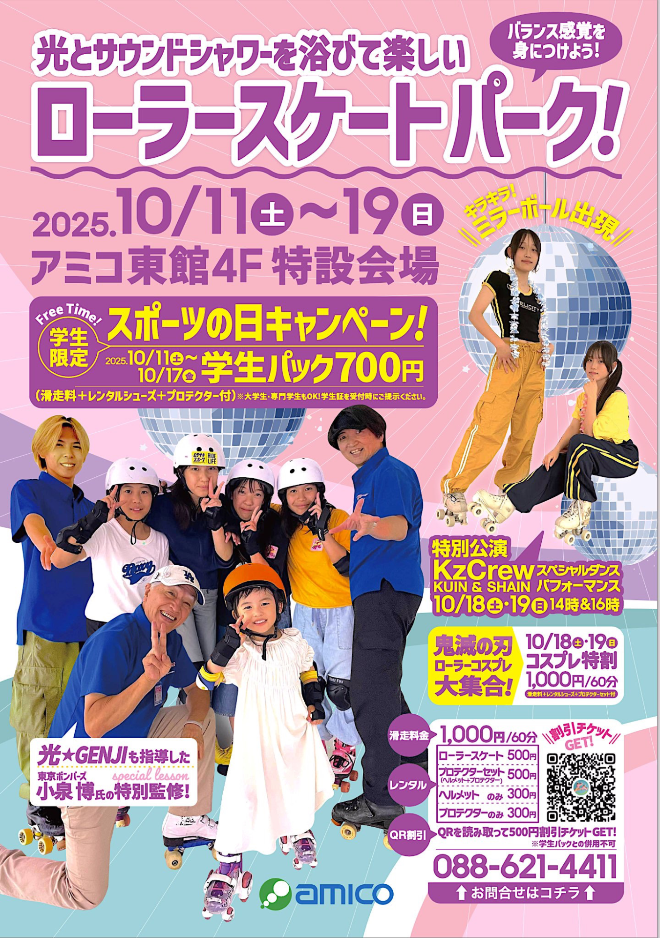 ローラースケートパーク開催!! 開催:2025年10月11日~2025年10月19日 ローラースケート体験会がローラースケートパークにパワーアップして開催!! 10月11日~10月17日の期間は、学生証提示で学割あり!! ぜひ、この機会に滑走してみませんか?
