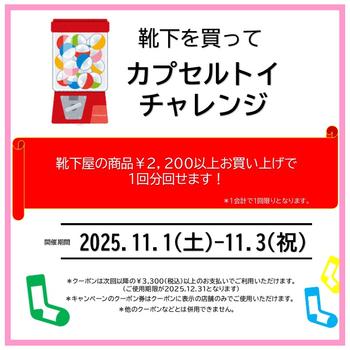 靴下屋POPUPストアで2,200円以上のお買い上げでガチャを1回分まわせます!