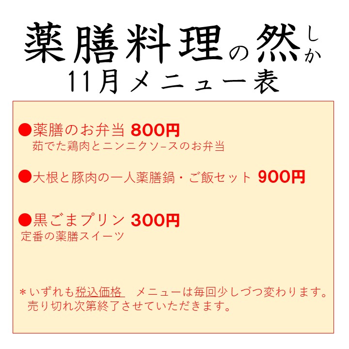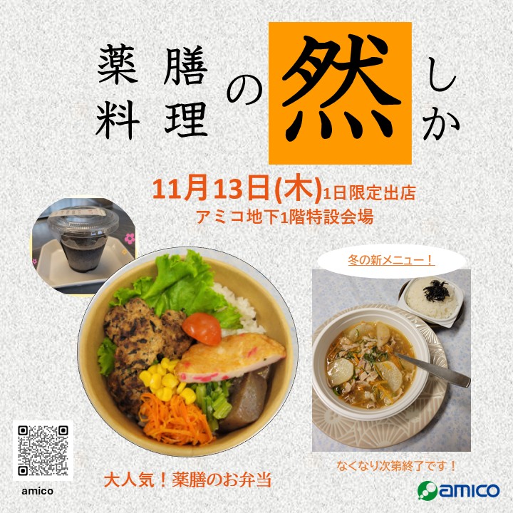 薬膳料理の然(しか) 1日限定出店!🎉 アミコ地下1階特設会場 開催:2025年11月13日(木) 体に優しい薬膳メニューで快調な1日を!👍 特にお弁当は人気で売り切れてしまいますので、お早目にご利用くださいませ。❤️