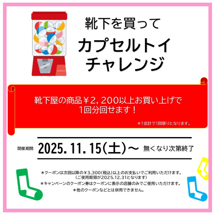 靴下屋商品2,200円以上お買い上げで、カプセルトイガチャガチャを1回まわせます!