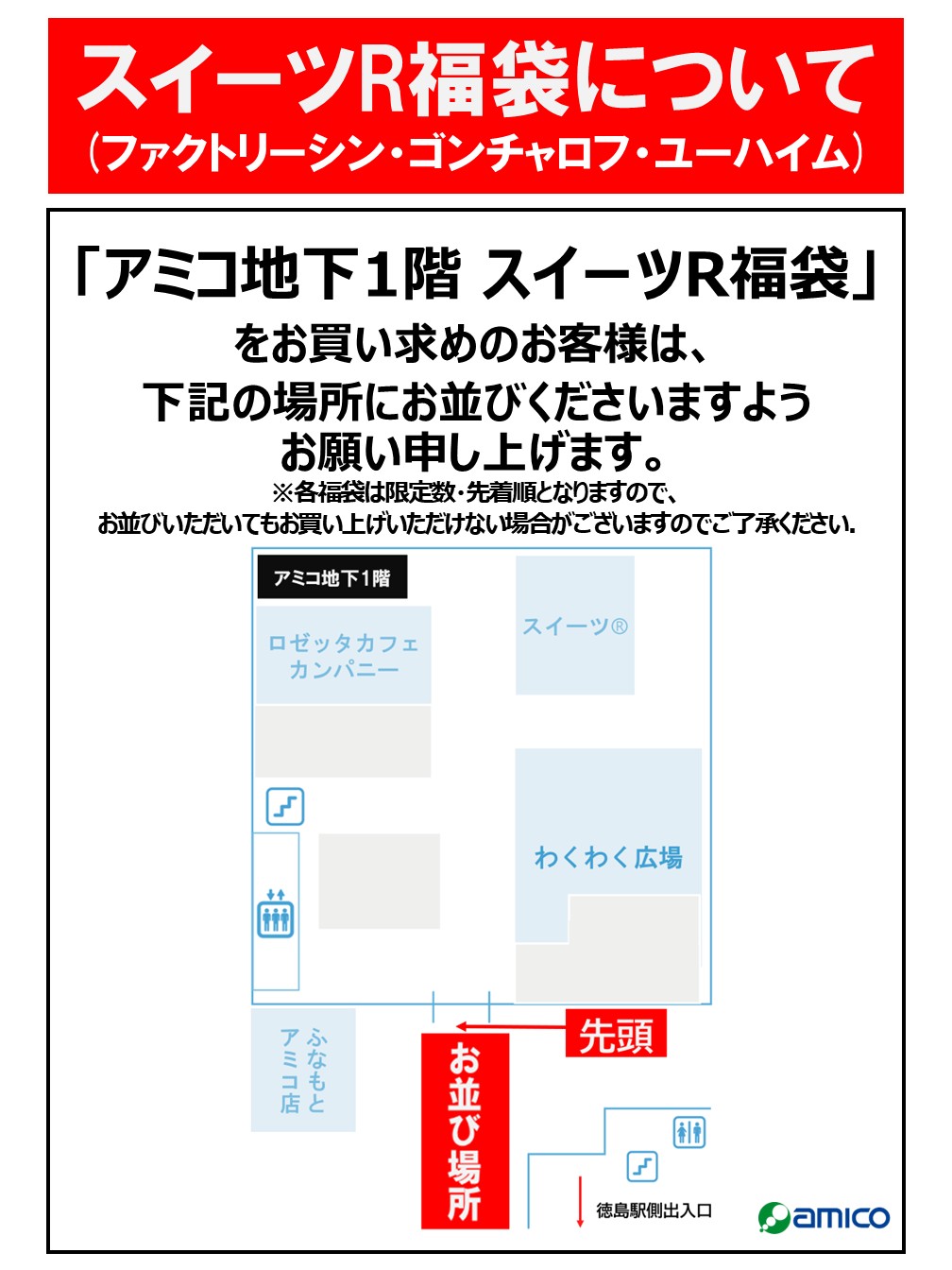 スィーツR(ファクトリーシン、ゴンチャロフ、ユーハイム)、ドンク、ジュピターの人気福袋につきましては、お買い求めの際に指定の場所へお並びいただけますようご協力お願いいたします。