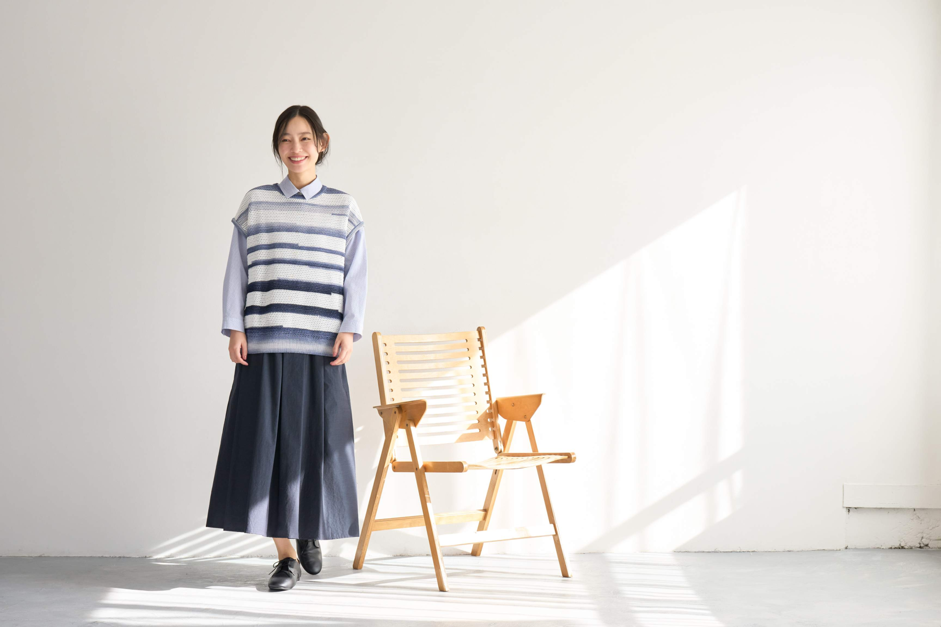 細いピッチのストライプ柄のシャツにカスリボーダーのニットベストはこの季節にぴったりの清涼感