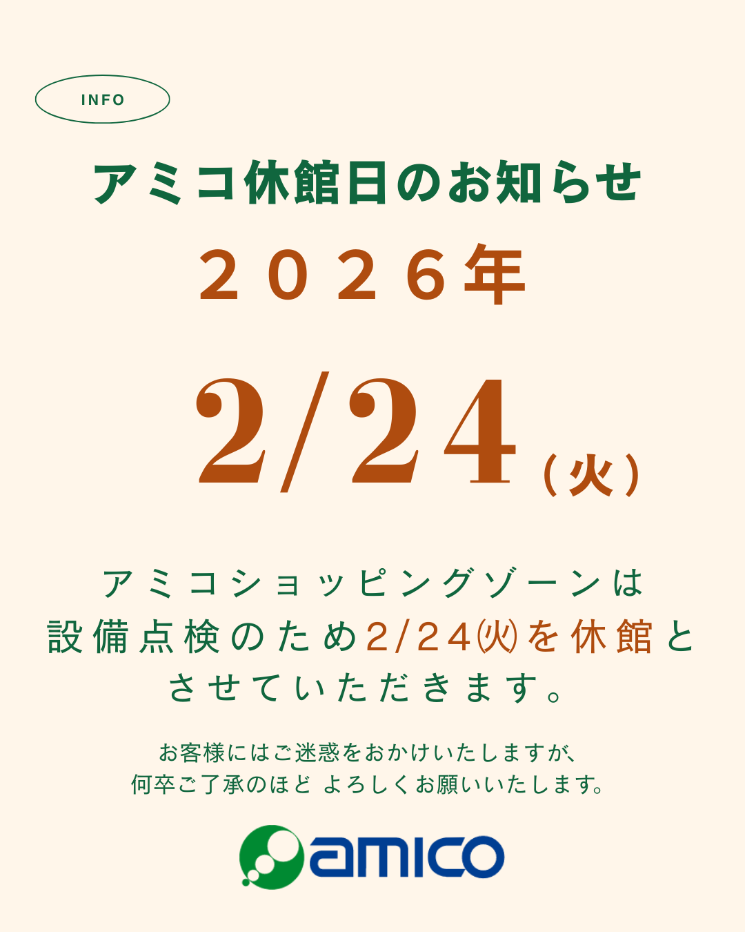 📢アミコ休館日のお知らせ📢 更新:2026年1月13日(火) 2026年2月24日(火)アミコショッピングゾーンは、設備点検のため休館とさせていただきます。 お客様にはご迷惑をお掛けしますが、何卒ご了承のほど よろしくお願いたします。
