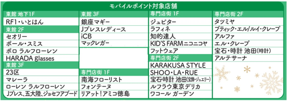 対象テナントで提示いただくと、お買い上げ金額税込108円に付き1ポイント付与となります。