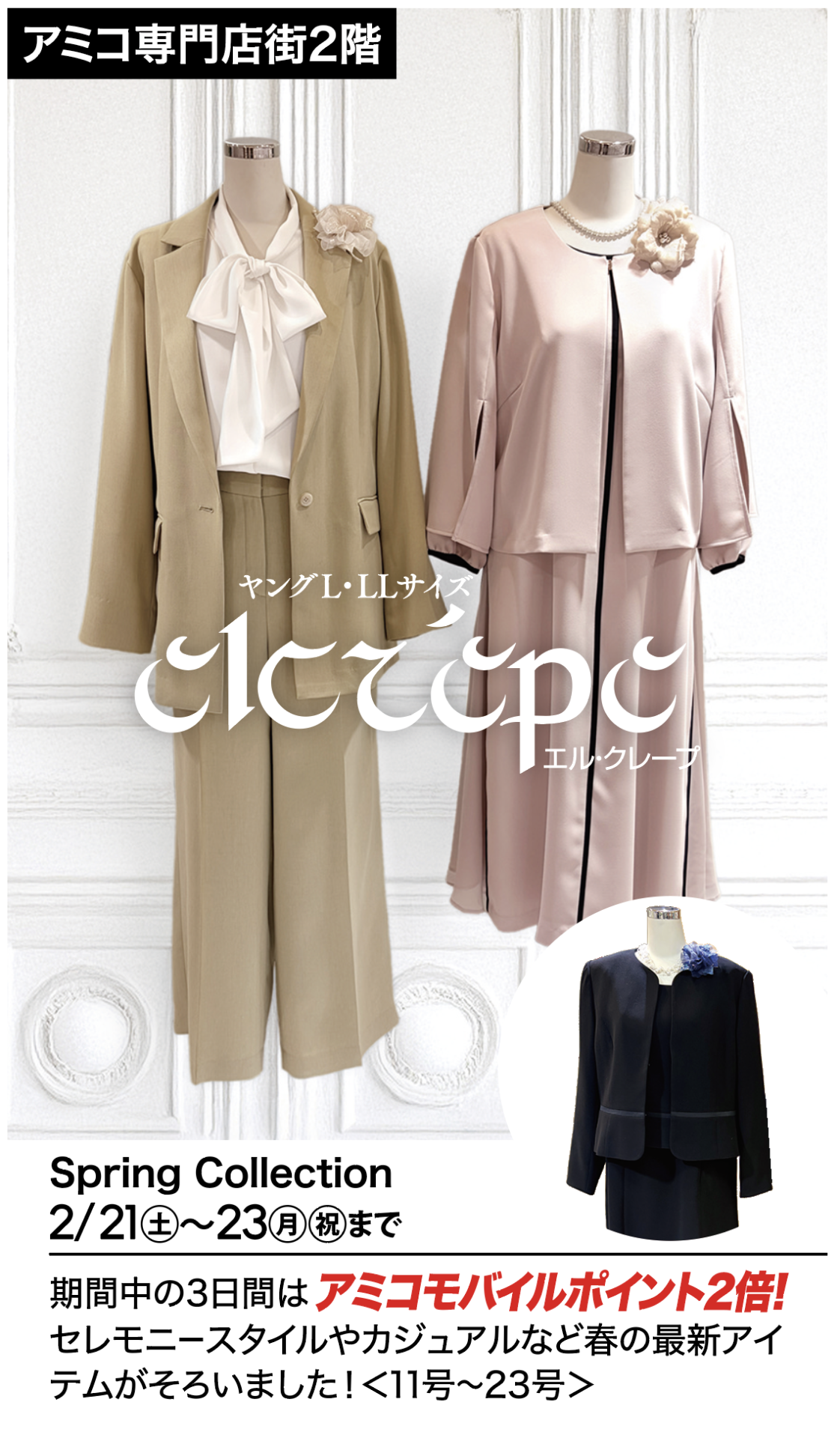 エルクレープ アミコモバイルポイント2倍のお知らせ 更新:2026年2月20日(金) エルクレープ 専門店街 2F ファッション レディース ショップ紹介 **「エルクレープ」**です🎵 カジュアルからフォーマルまで、11号~23号サイズの最新アイテムが豊富に揃っています✨ 📢お得なお知らせ**2月21日(金)~2月23日(日)**の3日間は\アミコモバイルポイント2倍デー開催📱/ 春に向けた新作をお得にGETできるチャンス🌸ぜひこの機会にお立ち寄りください♪